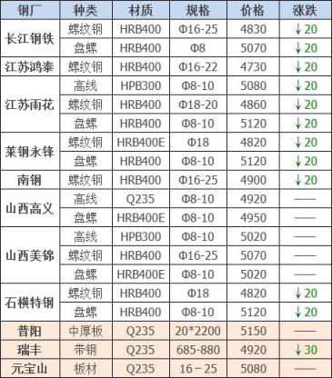 23日12:00起江陰西城刨花下調30-40,其他不變,調后:精爐料4000重廢3890中廢3830普通爐料3770鋼筋頭4000沖子3890-3940冷熱軋料3790-3890爐料壓塊3600鐵皮壓塊3300鋼刨花3660數控刨花3570普通刨花3480刨花壓塊3420刨花長絲3360含稅單位:元/噸。