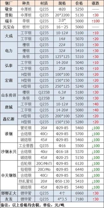 3月1日廣東河源德潤鋼鐵廢精密管價格格漲50元:鋼筋切粒3530;邊角料,新鋼板料3500;純鋼筋頭,直鋼筋3480;模具鋼、料頭圓鋼、軌道鋼、火車輪3480;硅鋼片停收;冷軋、熱軋、碎料沖子3430;優重3480;鍛打料、馬蹄鐵3480;重廢3450;機械生鐵、高碳鋼、鑄鋼件、生熟混裝3450;厚剪3400,不含稅。